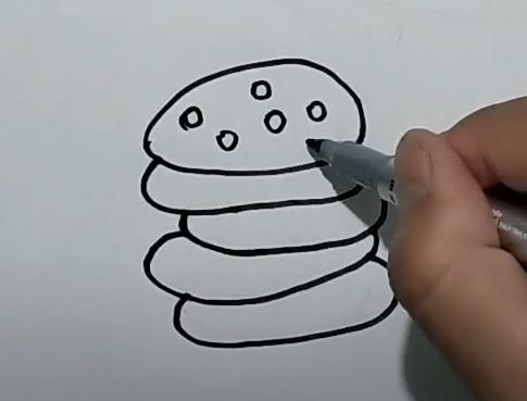 This image shows a hand drawing a cartoon-style cookie stack with chocolate chips on paper, ideal for art tutorials on how to draw food step by step, focusing on beginner drawing techniques.