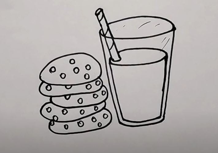 This image demonstrates how to draw cookies with chocolate chips paired with a glass of milk and a straw, useful for beginners learning to create detailed food illustrations through step-by-step drawing guides.