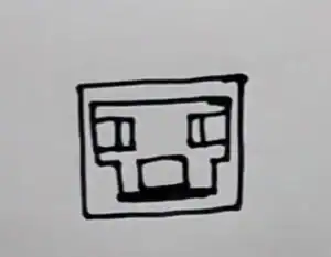 Sketch the shape of the sheep’s face. Draw a pair of blocky eyes on the face. Attach a small rectangle at the bottom of the face to form the sheep’s mouth as shown.