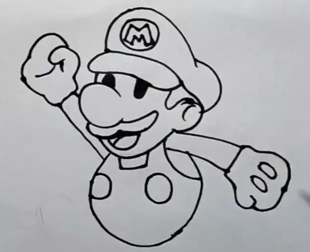 This image features a black-and-white line drawing of Mario, demonstrating the basic outline and features of the character for drawing tutorials and art projects.