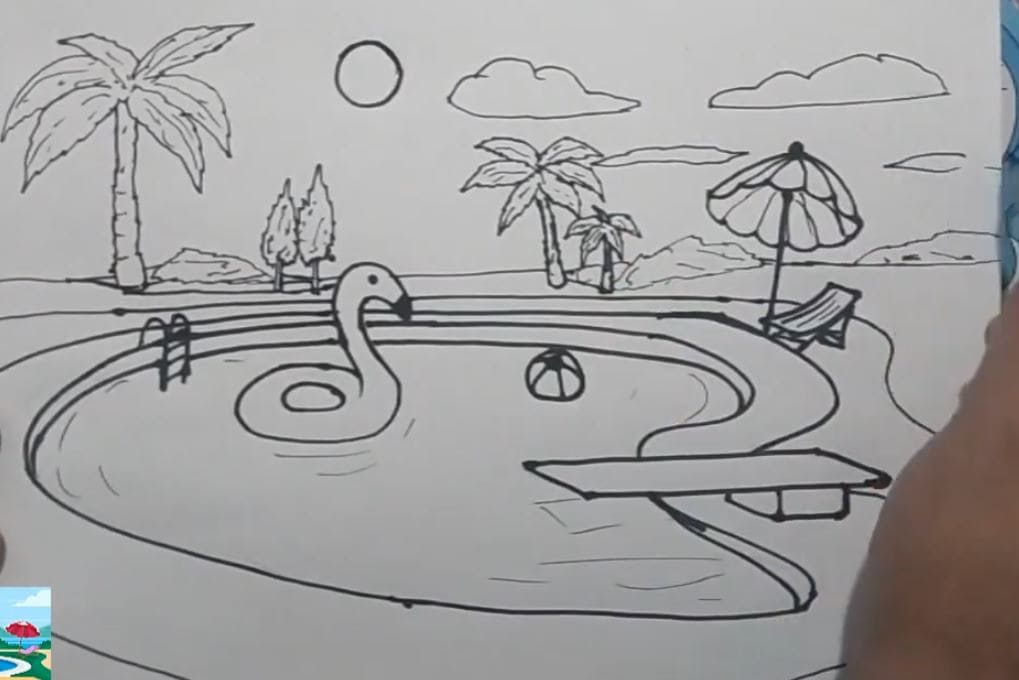 This image demonstrates the process of drawing a poolside scene, including a swimming pool, swan float, palm trees, beach umbrella, and lounge chair, perfect for art tutorials and beginner drawing guides.