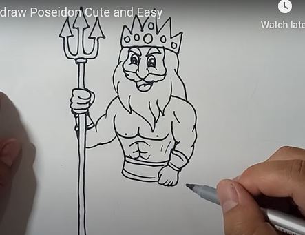 This image illustrates the initial stages of drawing Poseidon, the Greek god of the sea, focusing on outlining facial features, accessories, and body structure. It’s an easy-to-follow visual guide for learning how to sketch mythological characters step by step.