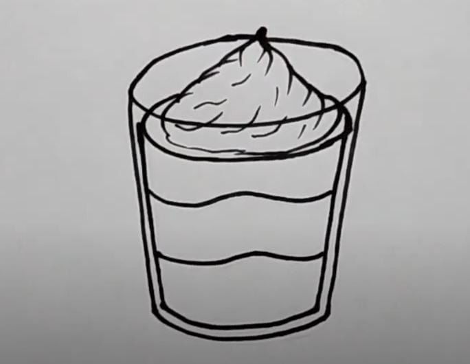 Drawings of a layered dessert in a glass with whipped cream on top, step-by-step illustration for learning how to draw desserts, perfect for beginners and art enthusiasts.