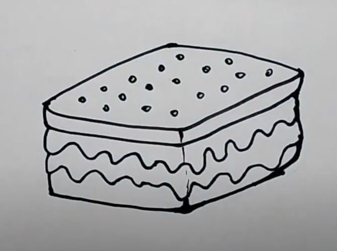 This image illustrates the process of drawing a basic sandwich, showing the different layers such as bread, filling, and toppings with clear, easy-to-follow line art, ideal for art tutorials and drawing lessons.