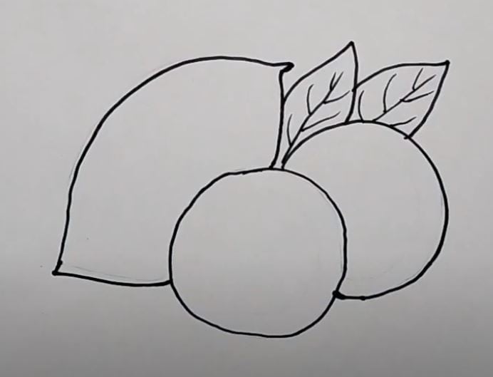 This image demonstrates a step-by-step guide for drawing oranges with leaves, focusing on basic shapes and outlines to create realistic fruit illustrations.